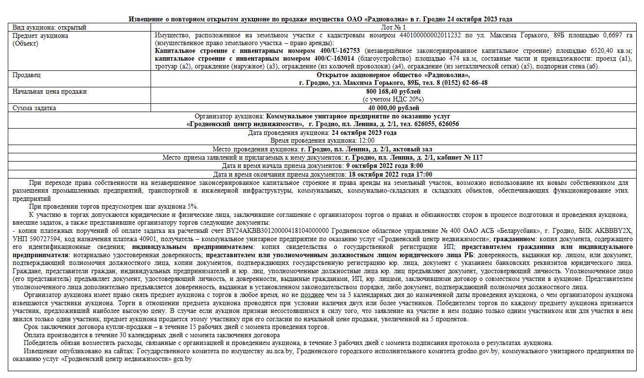 Извещение о повторном открытом аукционе по продаже имущества ОАО «Радиоволна» в г. Гродно 24 октября 2023 года 10/10/2023