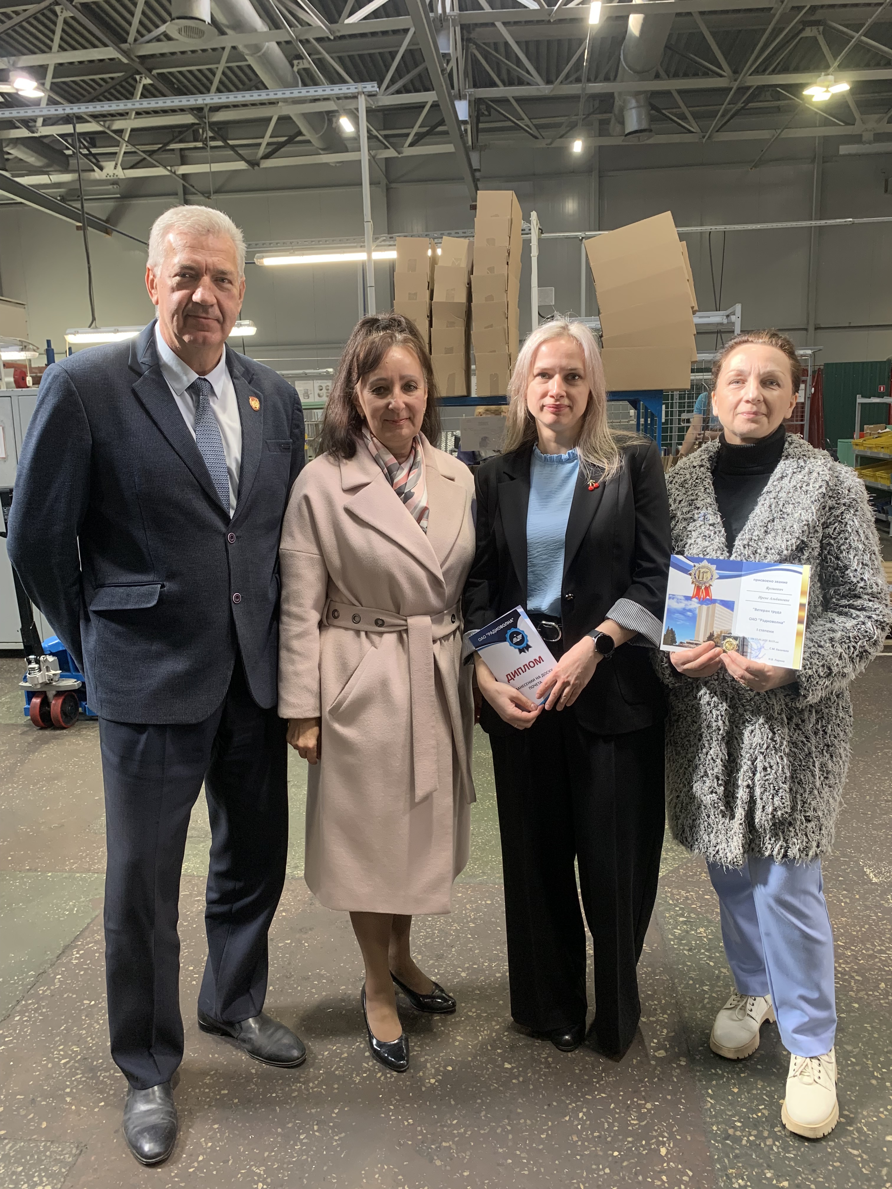 Занесение на Доску почёта – это форма поощрения работников Общества, которая является высшей наградой за добросовестный труд и внесенный вклад в развитие предприятия. Почётное звание «Ветеран труда ОАО «Радиоволна» было присвоено 21-му работнику: 12 работников удостоены звания «Ветеран труда ОАО «Радиоволна» 1-й степени, стаж работы которых на предприятии составляет 40 лет для мужчин и 35 лет для женщин, 8 работников – 2-й степени, стаж работы для мужчин 35 лет и 30 лет для женщин и 1 человек удостоен звания «Ветеран труда ОАО «Радиоволна» 3-й степени, которая присваивается работнику, добросовестно отработавшему в Обществе 30 лет (мужчины) и 25 лет (женщины). Заместитель директора по идеологической работе и персоналу А.П. Зайцев от имени руководства предприятия и себя лично поздравил работников с наступающим профессиональным праздником и вручил удостоверения «Ветеран труда ОАО «Радиоволна» и нагрудные знаки соответствующих степеней.
